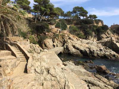 Today I started out with a Clif bar and a lukewarm cup of instant coffee. Lloret de Mar was my destination and should have taken about 2 hrs. 40 mins. I don't believe this accounted for time I spent gasping for breath on the endless flights of steep stairs and hillside up to the castle of San Juan at the top or stopping to take in the view along the way. Anyway...I left at 10am and arrived at 3pm. It is as beautiful as the internet told me it would be and I'm enjoying moving at my own pace and doing my own thing. There are several small, quiet coves that can be seen from up on the bluff where the trail is. Upon closer inspection I noticed that one was a nudey beach. Once in Lloret I put on my bathing suit and went to lay at the beach for a bit. I thought I'd fall asleep but I was too hungry so I went to find a late lunch / early dinner. I have promised myself I would try the Spanish fried anchovies those while here...maybe tomorrow.